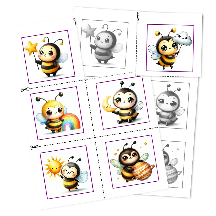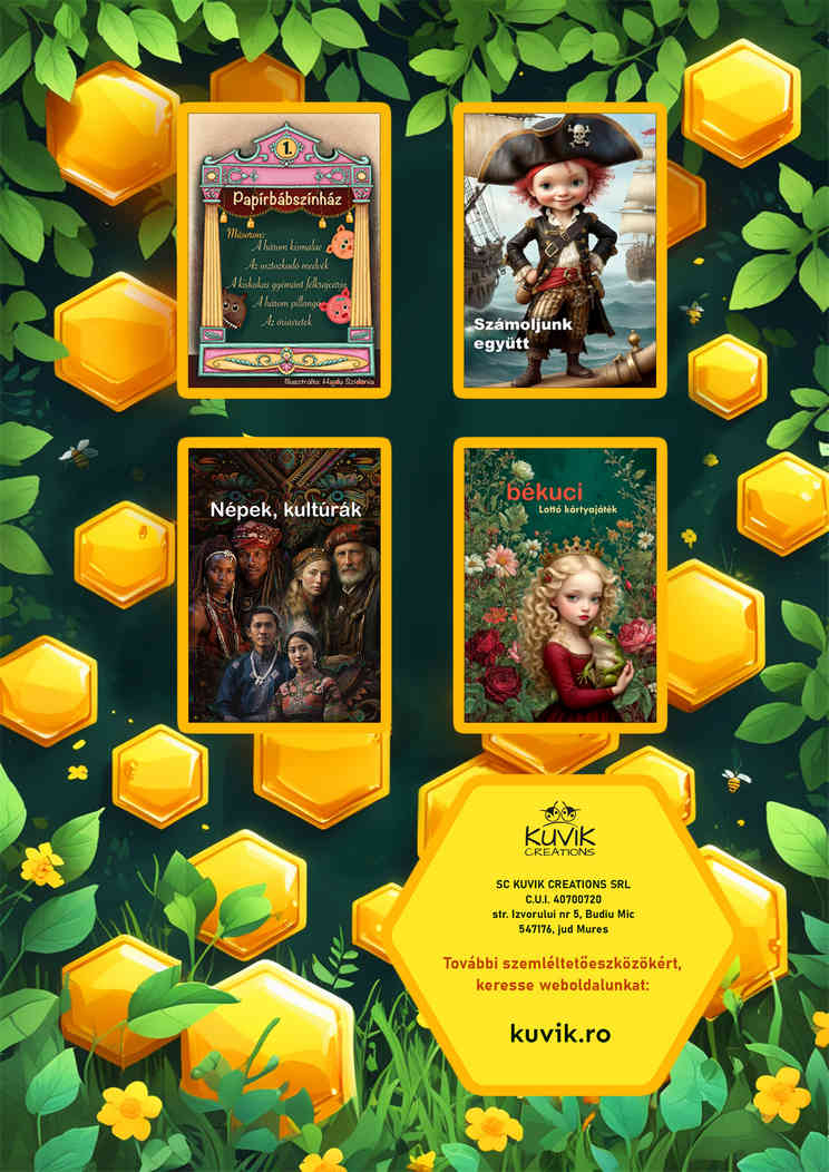 A kaptárban a kisméhecskék mindenféle tevékenységet kitalálnak: járművekkel közlekednek, édességeket, zöldséget és gyümölcsöket fogyasztanak, és még sok egyéb dolgot is művelnek! A lottó játék változatos képeket kínál a játékhoz, de akár beszédfejlesztés tevékenységekben is használhatóak az óvodában. Tartalma: 10-10 lap színes és fehér-fekete megfelelőjével, 6 kép mindegyiken. A színes lapokat fel kell darabolni a segédvonalak mentén.