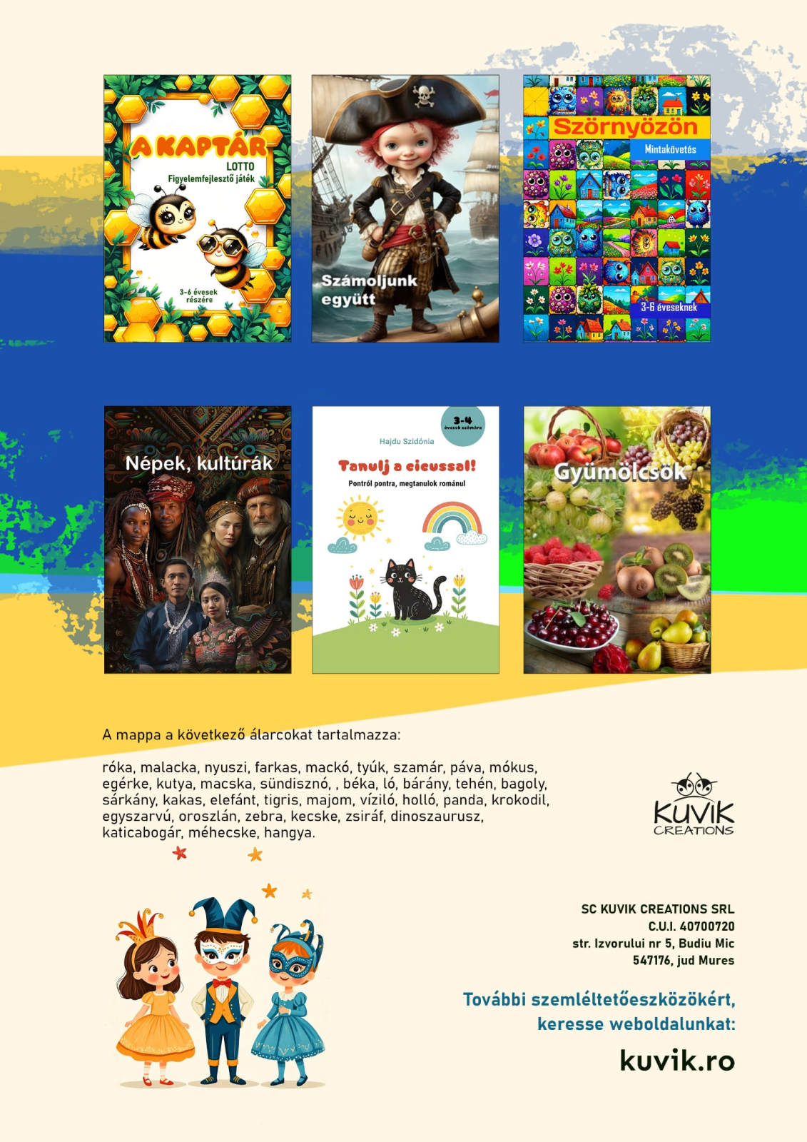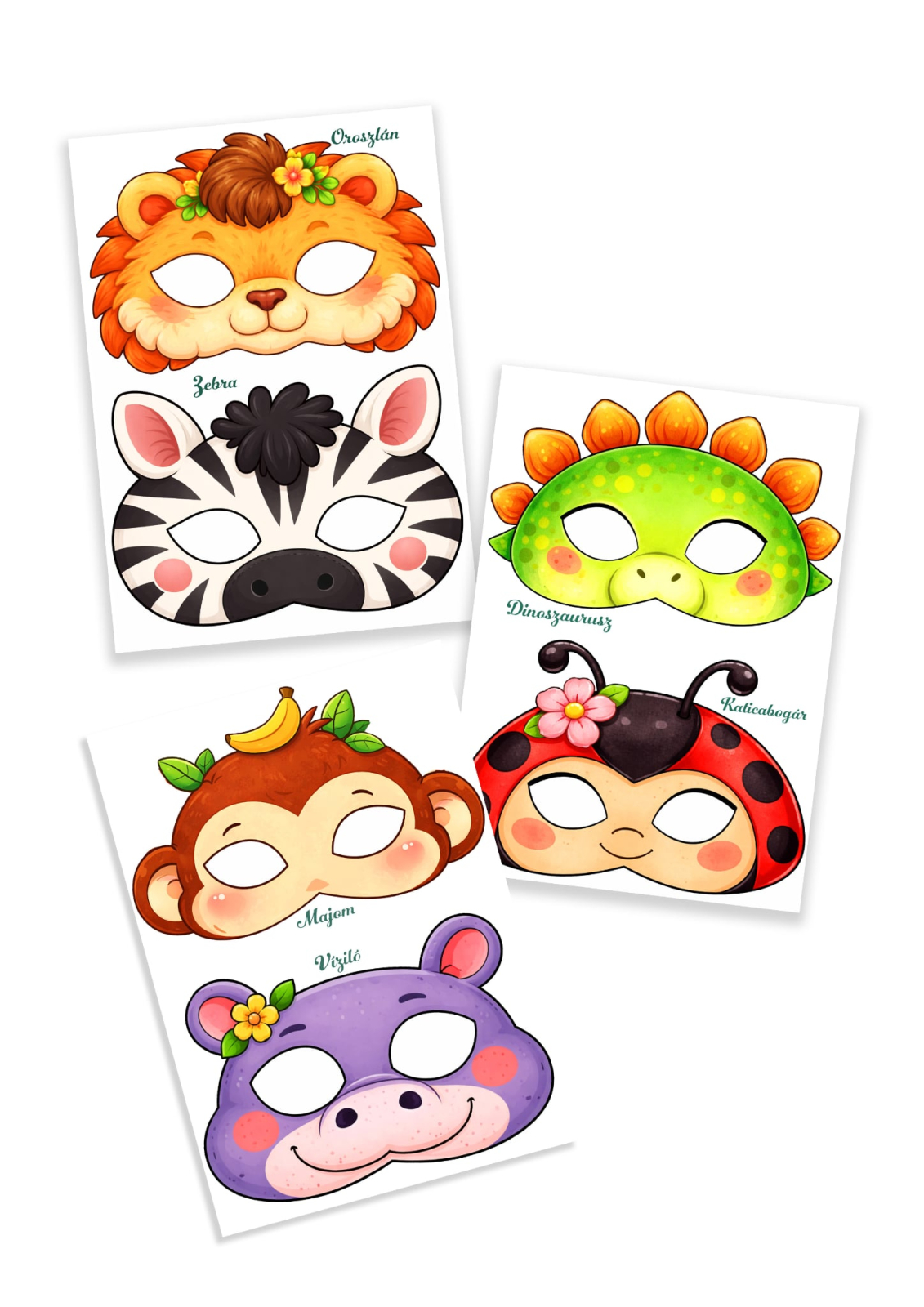 A mappa 36 vidám állat-karaktert tartalmaz, amelyeket felhasználhatunk a farsangi bálban. Az állatos maszkok megkönnyítik a szerepjátékot, segítve a gyerekeket abban, hogy könnyedén bújjanak különböző állatok bőrébe.