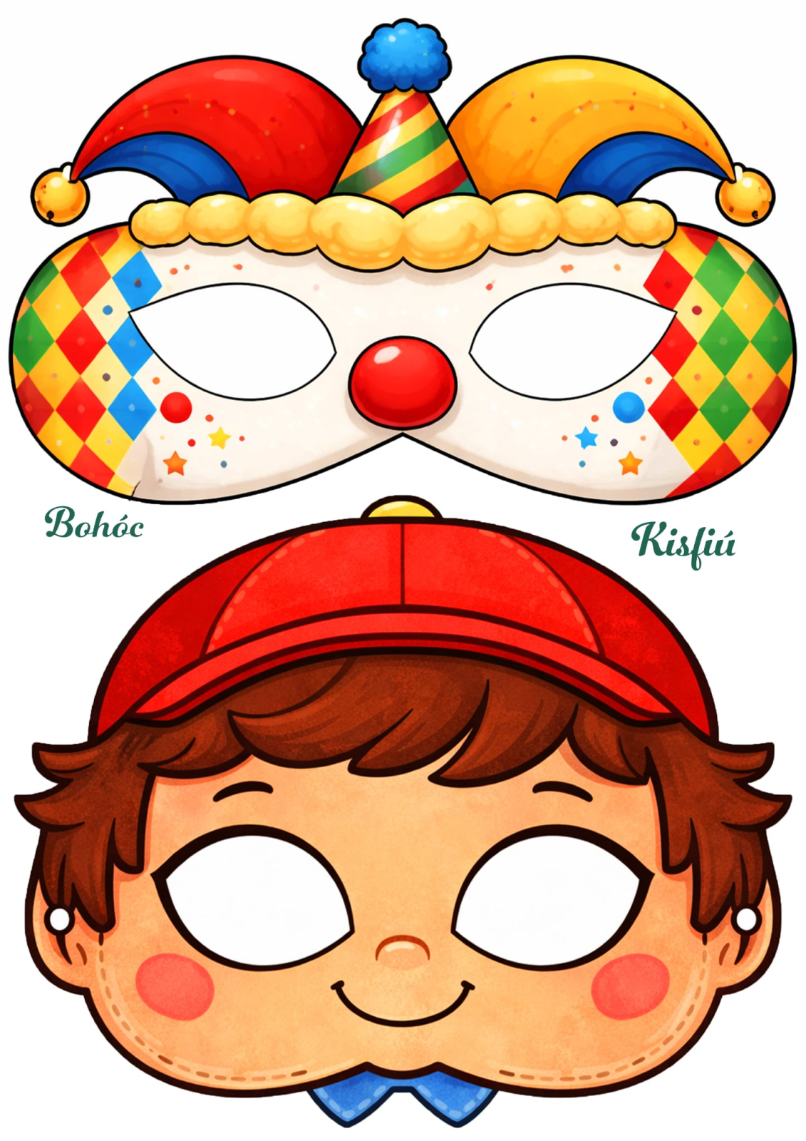 A mappa a következő álarcokat tartalmazza: tűzoltó, manócska, kislány, királykisasszony, nagyapó, nagyanyó, bohóc, kisfiú, Piroska, királyfi, szegényember, doktor néni, török basa, ördög, öreg királynő, szakács, rendőr, boszorkány, tündér, angyal, vadász, öreg király, varázsló, török szolgáló, apa, anya, óriás, rabló, kéményseprő, vasorrú bába, pap, katona, Mikulás, Pinokkió, pásztor, hóember, +1 huszár.